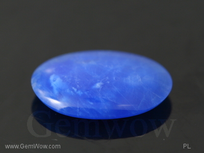 Good color shift. Looks different under yellow and white light. Tone is medium with a little "milk". Not your dark or light hued varieties but its own. It's a different kind of blue. Closer examinations shows white wispy inclusions. Weighs 3.58 carats and comes in the oval shape flatish dimensions. Good polish.