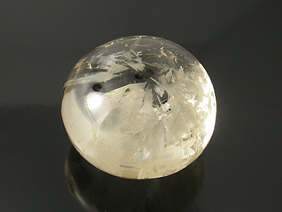 Like a flatter version of a ball, this topaz from Mogok allows you to go deep inside the "sphere" and examine its inner world. An iridescent "lily pad" inclusion, white "straw, pointed "brush", parallel needles, fingerprints, thin veils are all inclusive for your study. |