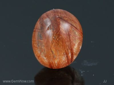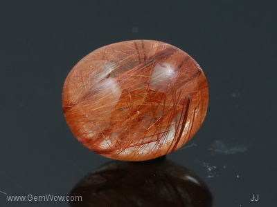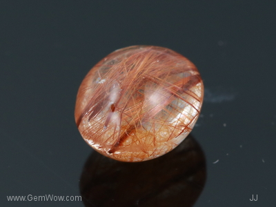 Double cabochon with rounded dome. A not often seen hue of mandarin - light orangy hue...... an iconic "Hermes" orange of interwined rutile needles giving a very very attractive orange color of medium tone. A tinit of blue "flash" on the side of the cab evident upon "rocking" the stone under a direct light source. A "Wow" stone for the discerning buyer of exquisite tastes.