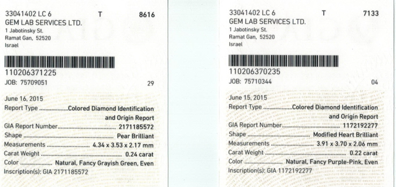 Natural Fancy Purple-Pink Diamond 0.22 cts (GIA certificate #1172192277) and Natural Fancy Grayish Green Diamond 0.24 cts(GIA certiticate #2171185572)