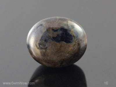 Dark blotches against bronzy metallic looking rutile background gives a contrasting appearance. Very faint asterism. Nice as sample. (LA)