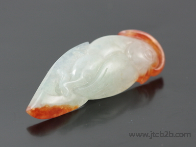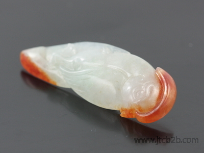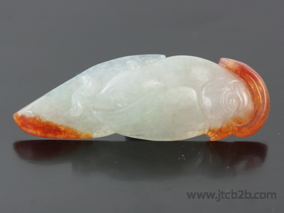 หยกเจดไดร์ทแกะสลักรูปนกแก้ว ส่วนที่เป็นสีส้มเกิดจากการเผา ทำให้ชิ้นนี้มีความโดดเด่นสวยงามของสี ทั้งการแกะสลักนั้นมีความประณีตละเอียด และยังมาจากประเทศพม่าแหล่งของหยกเจดไดร์ทคุณภาพดี