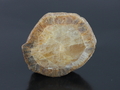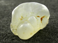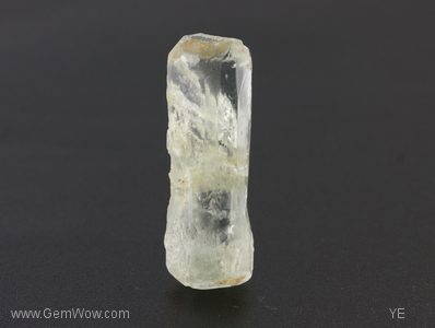 Dogbone shaped aquamarine. Here is a colorless beryl with a funny shape. This specimen does not show the strong prism faces normally seen. Instead, it has a more-or-less triangular cross-section and many skinny faces running its length. The really unusual feature is how the stone tapers in and then back out again as you pass down its length. It is mostly transparent with a deep hole in one side. Don't feed this one to your dog!! |