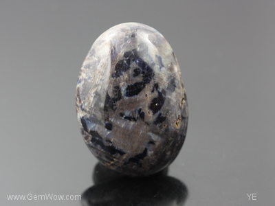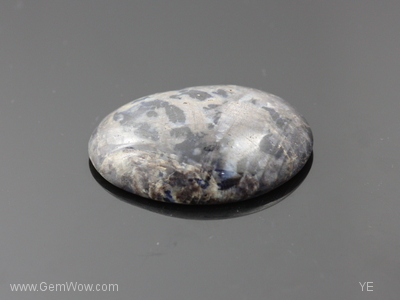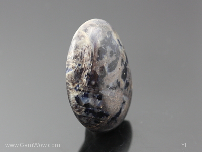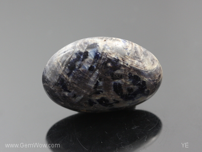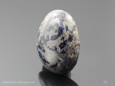 Perhaps the largest one we have come acrossed, this unique and large cab sapphire has a bronzy mettallic base interspersed with blue and blue black \"island\" shaped color spots. Minute open surface cavities can also be observed as well as cellular transparent tree like growth structure on one side of the cab. Weak diffused \"asterism\" is present. Flat bottom. Good sample piece. |
