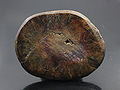 The back side looks like a non-descript metorite - black and nodular. The "face" however has a black hexagonal center with and white ring with radiating edges surrounded again with a black perimeter. The black appears to be dark blue under strong white light examination. The polish has a high shine and there are layers of "silk" giving the stone a nice "sheen". Hey! It's not called the "Great Eye of Burma" for nothing!