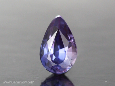 A purple tip and blue top in a pear shape saphire from Burma. Almost like a bi-color, the coloration is concentrated in different parts of the stone. The clarity is very good and the cutting is good.
