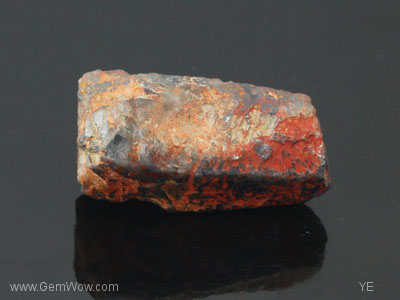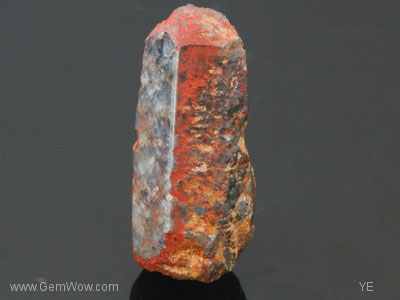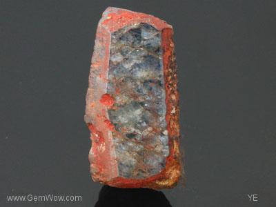 The snakeskin sapphire! This crystal displays five well formed and one eroded prism faces. The \"skin\" of this crystal is pitted and stained with a reddish material. One face has been polished so that you can see inside. The true nature of this stone has been revealed.
