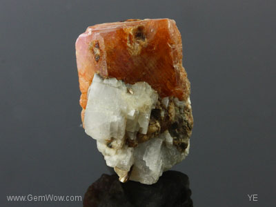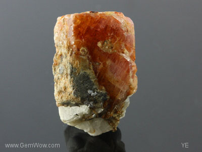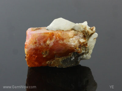 A ruby crystal from Burma. This proud piece has still some calcite crystals attached, where the rubies are typically found in Mogok. The most of the prism faces of the ruby are well developed and showing some very nice luster. You easily can see a lot of bohemite needles intersecting at 60 degrees as well as polysynthetic twinning throughout the stone. The color is orangey-brown to light pink and the clarity is apart from some parts at the surface translucent. Also the calcite has a distinctive shape and small mica crystals are imbedded as well. A beautiful natural assemblage and a great collector’s item. SE |