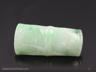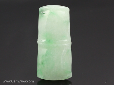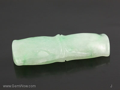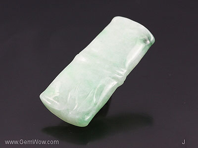 หยกเจดไดร์ทสีเขียวอ่อนเนื้อโปร่งใสสวย บางจุดเป็นสีเขียววิวิด แกะสลักรูปต้นไผ่ ซึ่งเป็นสัญลักษณ์ของอายุที่ยืนยาว ได้รับการขัดเงาอย่างดี