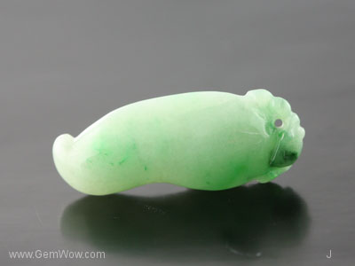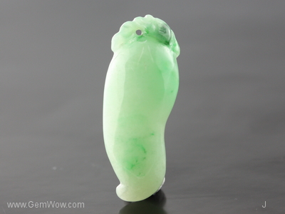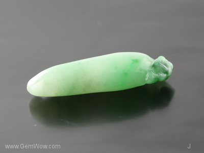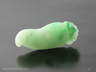 หยกเจดไดร์ทแกะสลักรูปพริก มีสีเขียวอ่อนเกือบเขียวกลางๆ ออกไปทางสีเขียวแอปเปิล เนื้อดีโปร่งใส ได้รับการขัดเงามาอย่างดีมาก