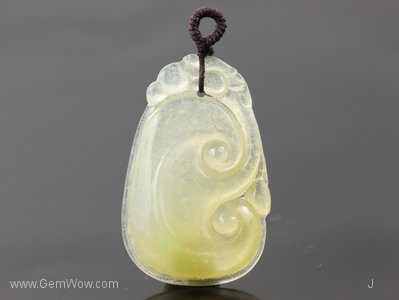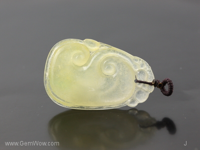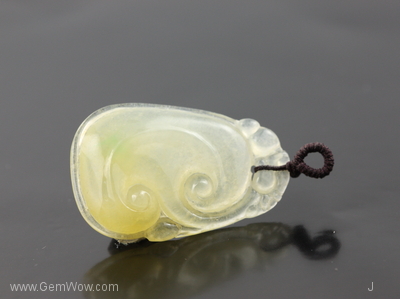 This near transparent soft hay yellow jadeite carving is among the top pieces in our jade collection. It is rare to find such a piece with a pastel yellow in this glassy variety desired by all. Showing balance and uniformity, the striking item and sure to draw oous and aahs. A favorite item and Wow piece! |